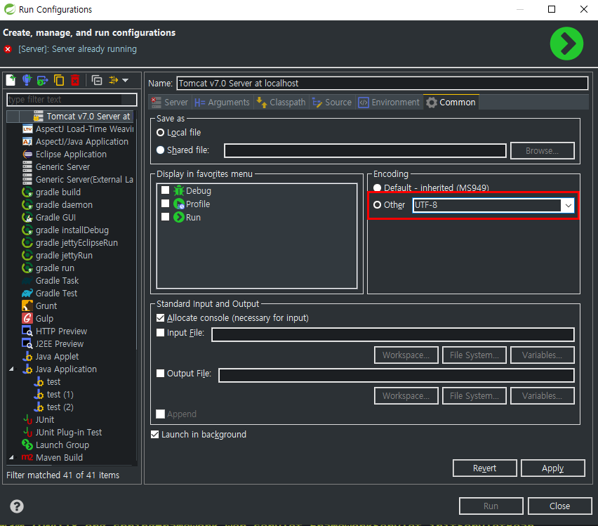 - Run>Run Configurations에서 Tomcat 선택 후 Arguments 탭의 VM arguments에 -Dfile.encoding=UTF-8 추가